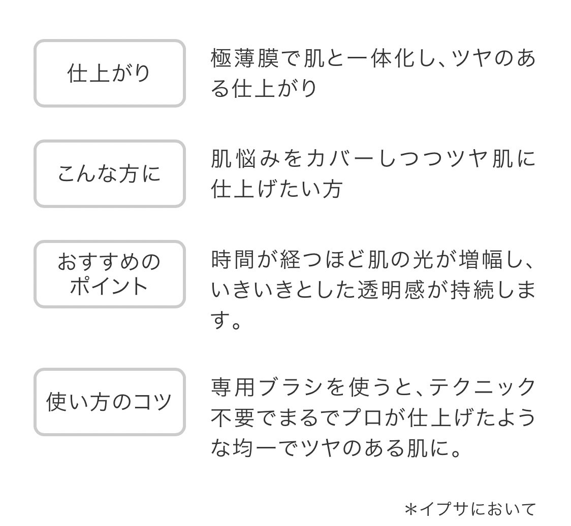 5度見する程の美肌だった人がコレ使ってるって紹介してて買ったイプサのファンデ👸💕私も友人に勧めたら良すぎて即買いしたと連絡きた。 ブラシで馴染ませるだけで肌に光が宿る。皮脂を艶に変えるらしく時間が経った後のイヤなテカリ感がないのが素晴らしい👏素肌っぽいのに肌めっちゃ綺麗にみえるの。