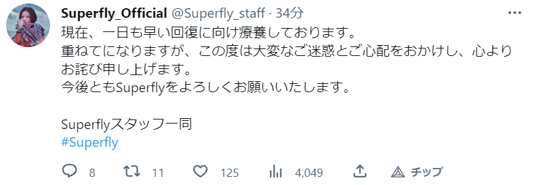 「Superfly」越智志帆氏(39) 体調不良で24日フリーライブ中止