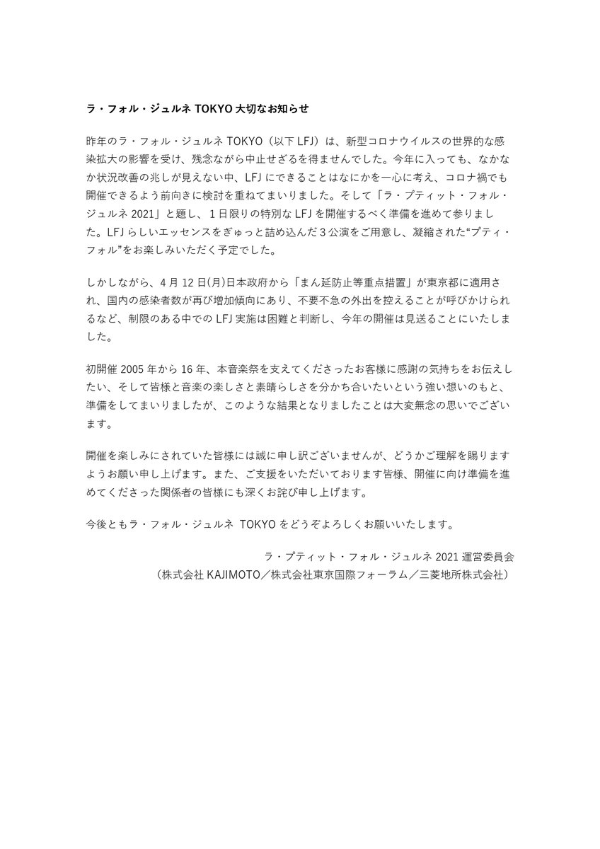 今年こそ、と思っていた中でこのようなお知らせをしなければならなくなってしまったのは大変無念ですが、またみなさまと音楽の喜びを分かち合える日が来ることを信じて、前を向いてまいります。 twitter.com/LFJtokyoBLOG/s…