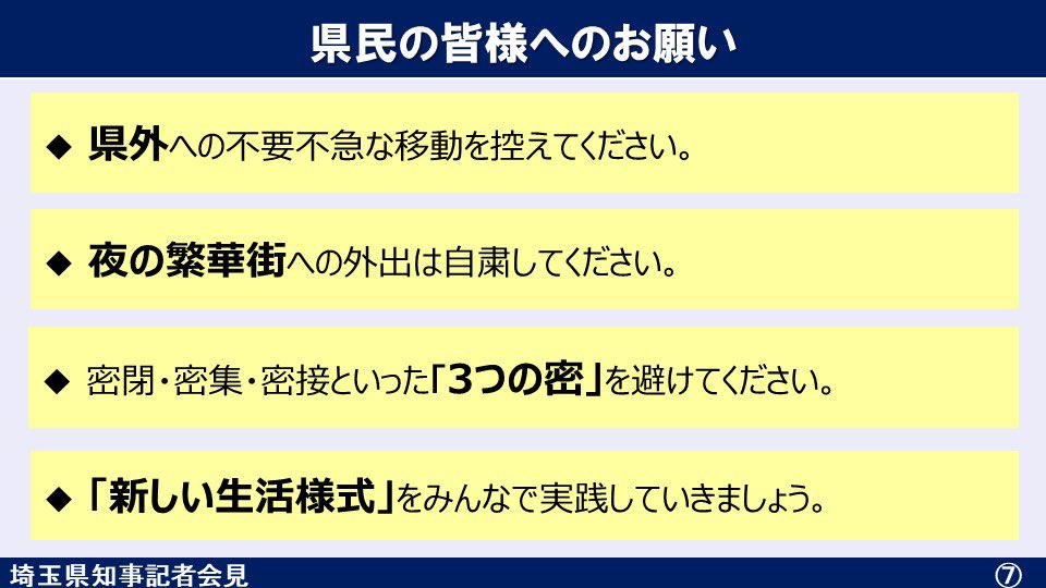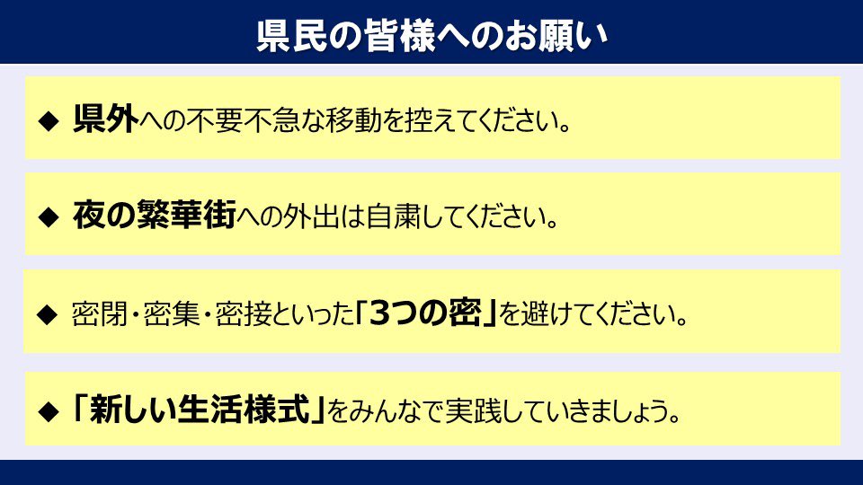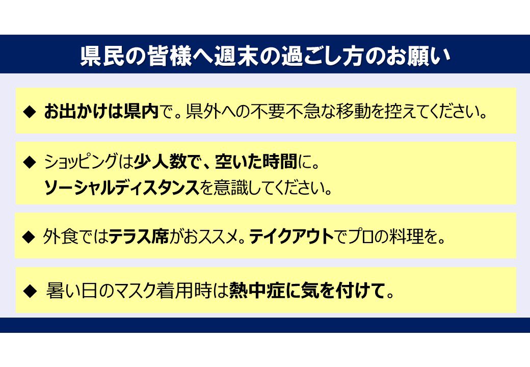 県民の皆様、週末は県外への不要不急なお出かけは自粛頂き、是非県内で用をお済ませください。