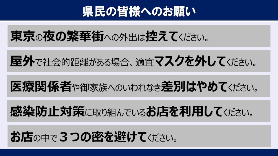 県としては、都内での大人数での飲食や繁華街へのお出かけは可能な限り避けていただくとともに、ご高齢の方や基礎疾患をお持ちの方は県都境を超えた不要不急