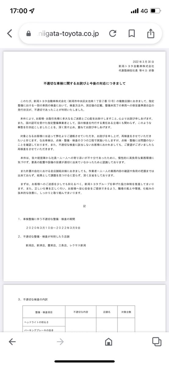 本誌が新潟トヨタ新潟店に対して国交省の監査が入ったとスクープした件。本日、新潟トヨタが不正車検について公表しました。不正車検は少なくとも5店舗で500台にのぼります!