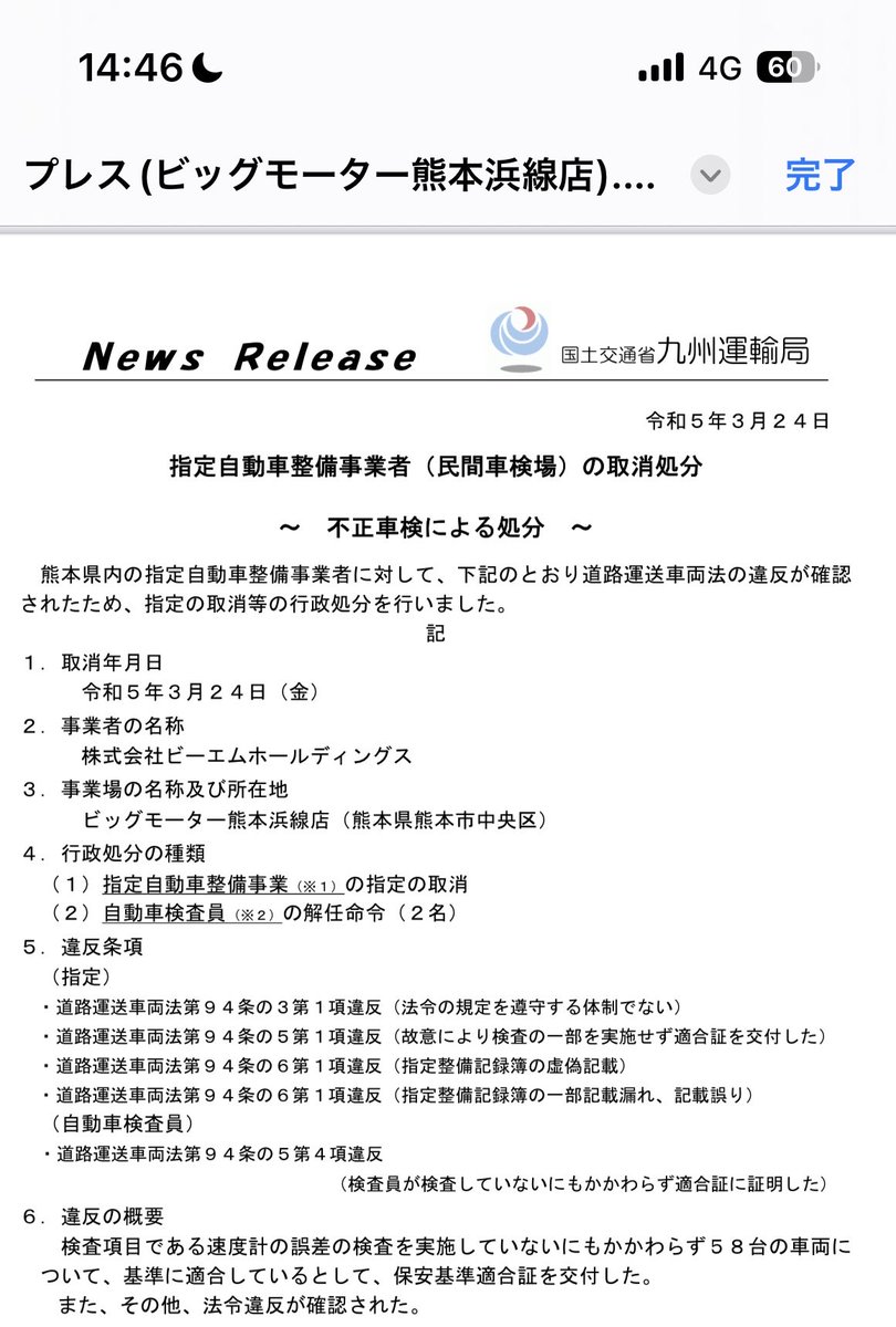 ビッグモーター熊本浜線店が指定取り消しとなりました。検査員2人も資格取り消しです。ビッグモーターの不正車検はまだまだ出てきそうですね。