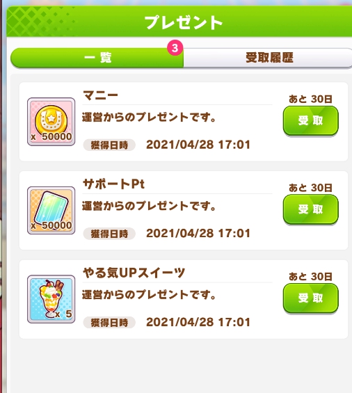 ぱかチューブっ!チャンネル登録者数50万人記念で全プレイヤーに下記アイテムがプレゼントされています!