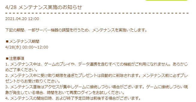 4/28(水)0時からお昼12時まで、メンテナンスでゲームプレイができなくなります。