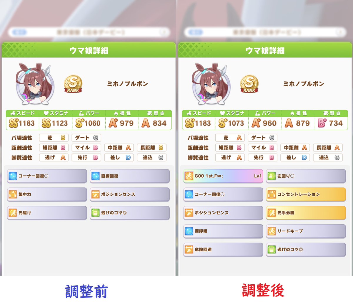 ナリタタイシンの日経賞後イベントですが、練習ベタを治さないパターンと治っているパターンではステータス上昇量も違うことが判明しました!