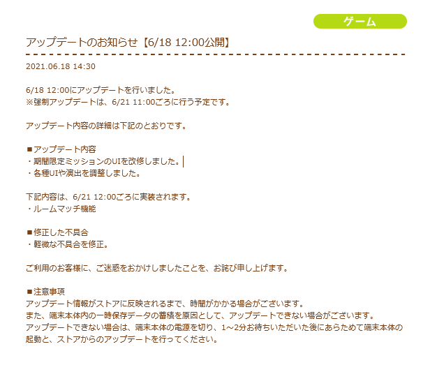 本日12時にゲーム内アップデートが行われました