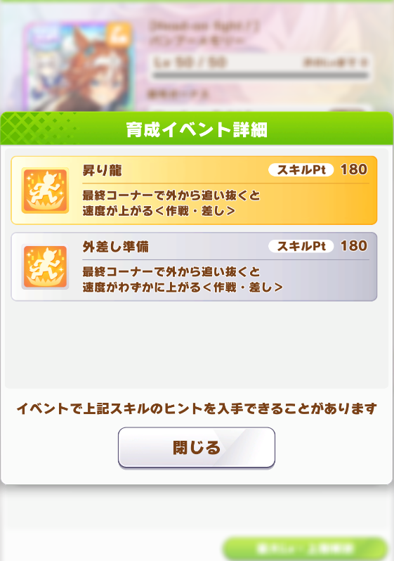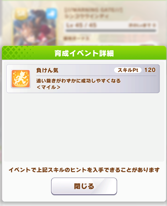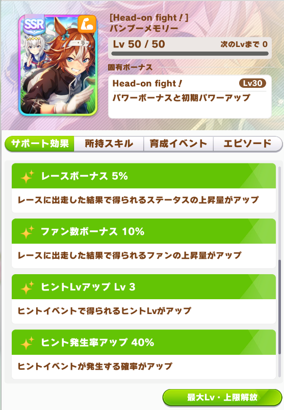 ・ヒントLvはないが、レースボーナス、トレ効、得意率、各種ボーナス所持