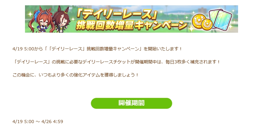 また、4/19よりデイリーレース挑戦回数増量キャンペーンが開催が告知されました