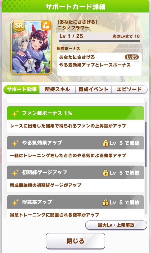 SRニシノフラワーは予想どおり所持スキルもSSRと同様でしたが、パワータイプとなっています!