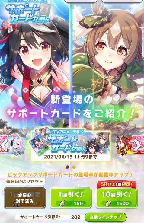 本日12時にガチャ更新がありますが、ウマ娘ではガチャ更新時に1日1回50ガチャがリセットされる仕様なので、いま引いても新ガチャ実装時には復活します!