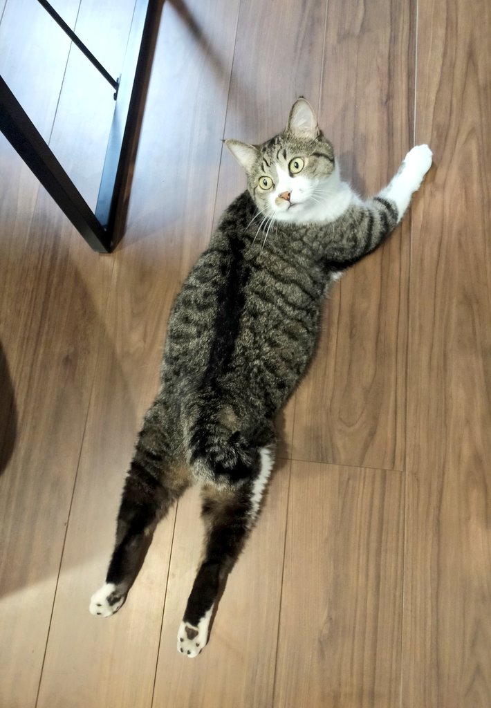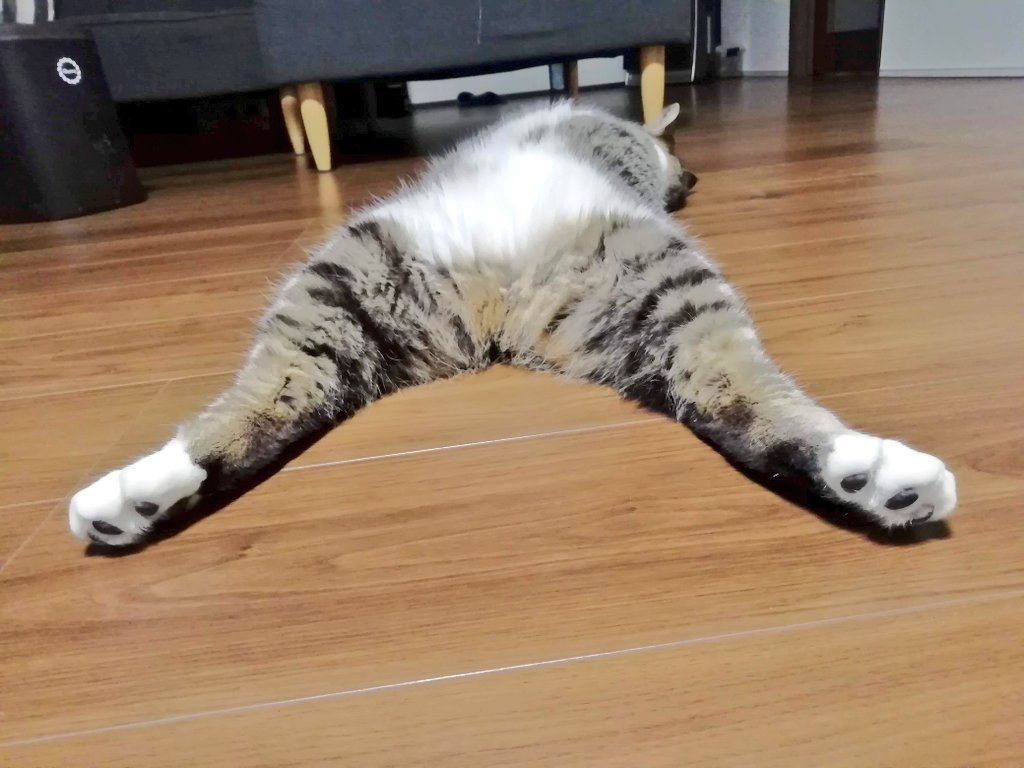 猫さんが時折見せてくれるたいへん可愛らしい仕草「両足プルプル伸び」の撮影に成功しましたのでご査収ください