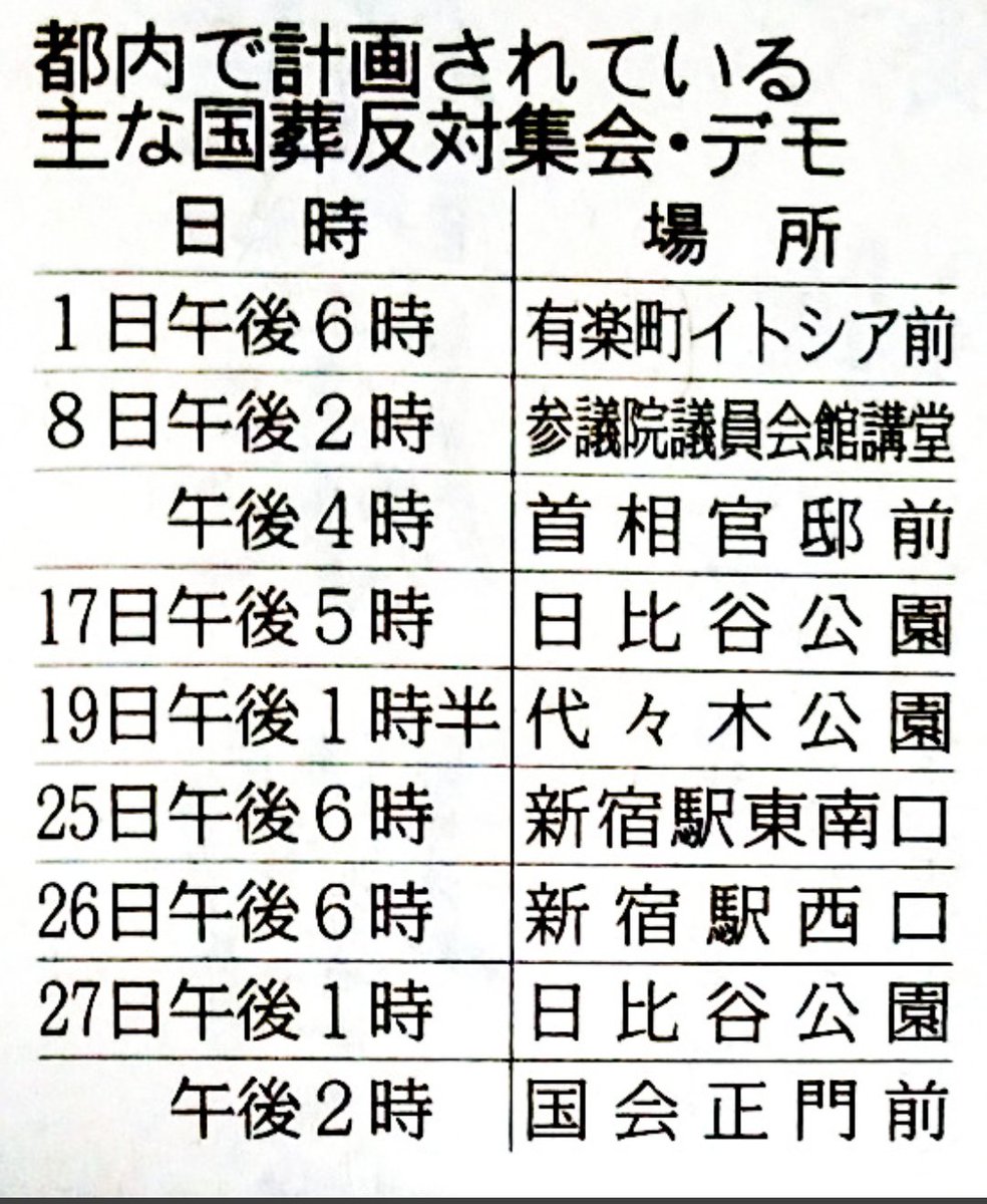 都内で計画されている主な「国葬反対」の集会・デモ情報です!!