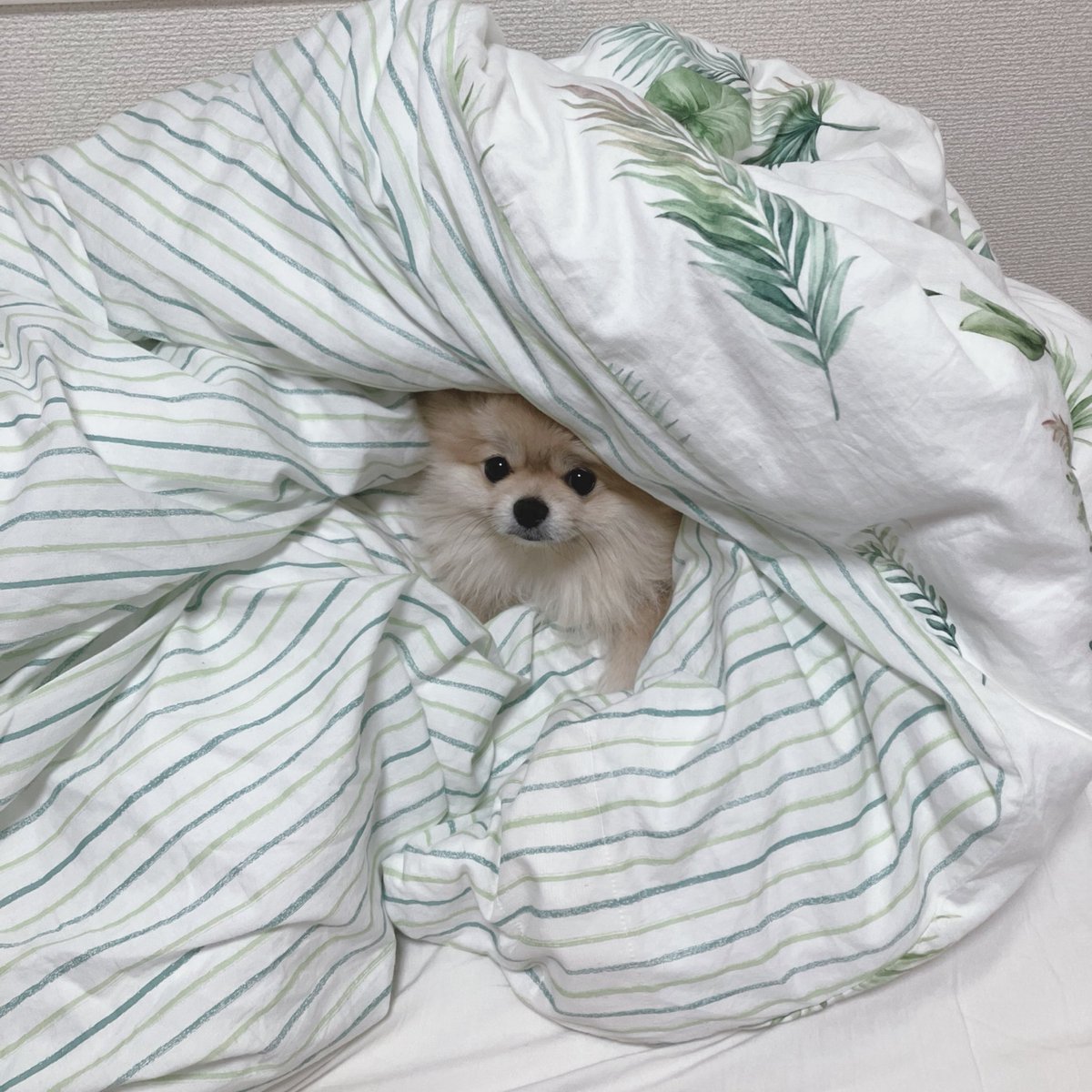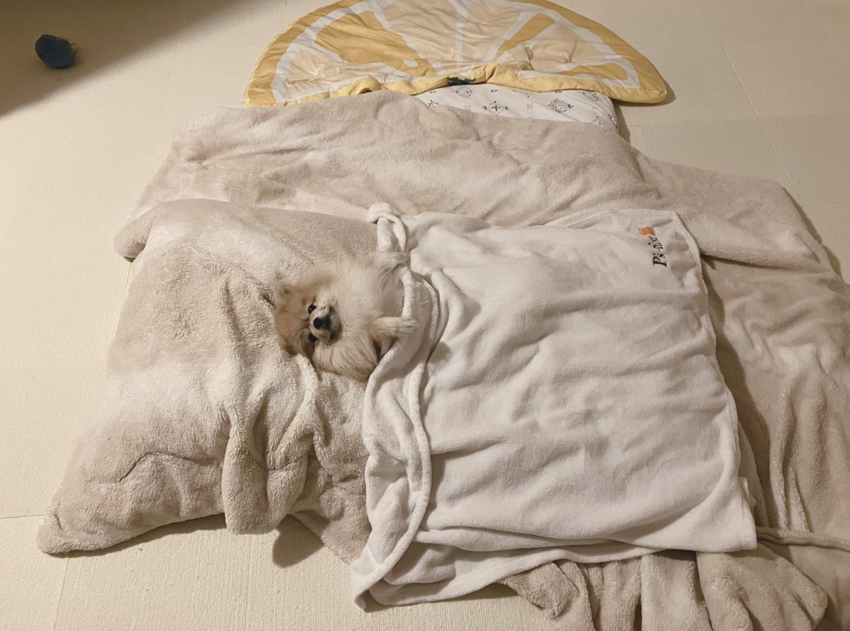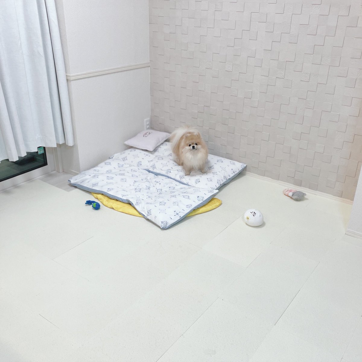 おかあしゃんがベッドで寝ようとすると、慌てておもちゃ咥えて遊びに誘ってくる
