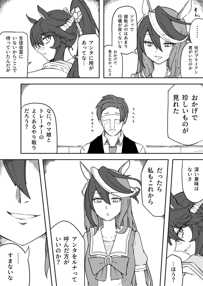 トレーナーに気を許してる会長がすごく可愛いなぁと思って描かせていただきました。