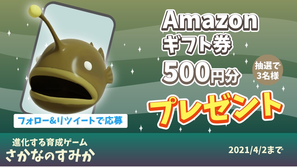 みんな育成ゲーム『さかなのすみか』で遊んでくれてありがとう!感謝を込めてAmazonギフト券1000円を抽選で2名様にプレゼント🎁
