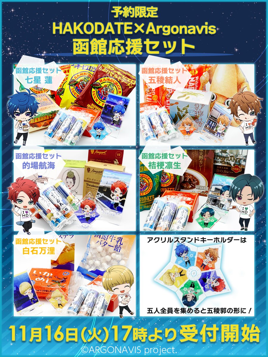 メンバーの描き起こしSDイラストが使用されたアイテムと名店によるご当地グルメがセットになった「函館応援セット」はメンバーごとに全5種ご用意✨