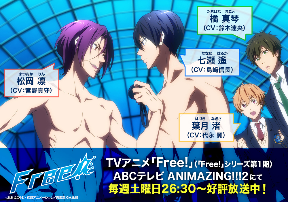 毎週土曜日26:30よりABCテレビにて、TVアニメ「Free!」(TV第1期)好評放送中!