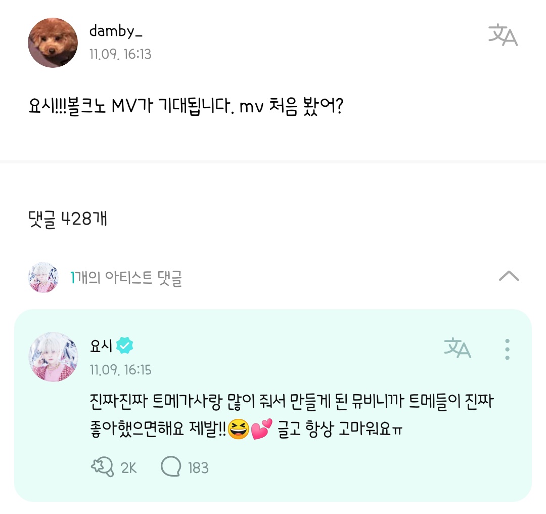 🐯: Ini tuh MV yang dibikin karena (lagunya) dapet banyak cinta dari Teume, jadi aku harap Teume juga bakal suka plis!!😆💕 Oiya aku juga selalu berterima kasihㅠ