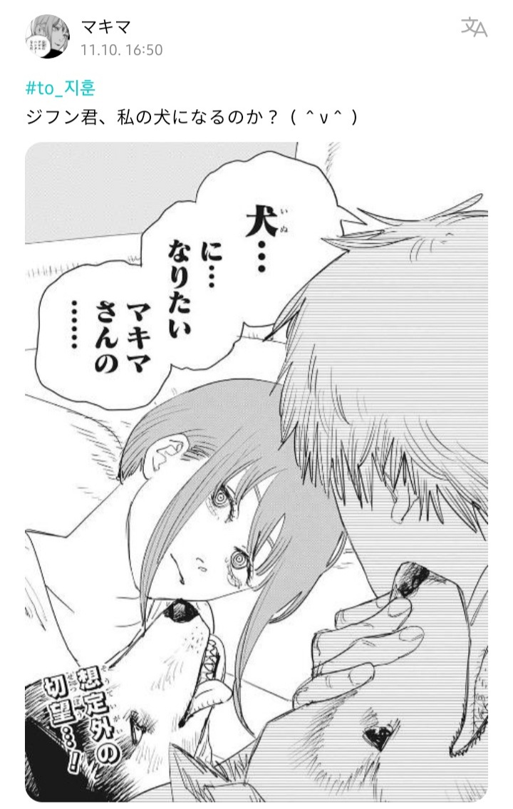 [ dialog di foto: "Aku pengin jadi anjing. (Anjing) punyanya Makima-san" (uname op: Makima)