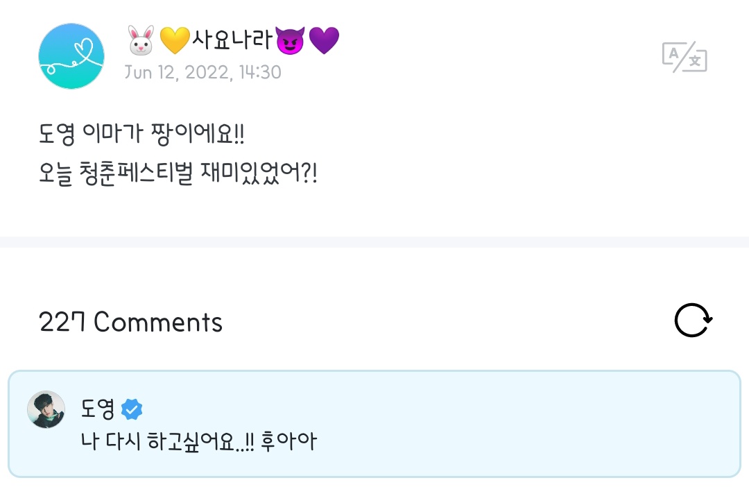 🐰: Ini kali pertamanya aku dengerin sorakan, terus pertama kali juga turun dari stage terus main main. Seneng banget, kalau nanti ada lagi aku bakal main dengan lebih bebas sama Teume__💓