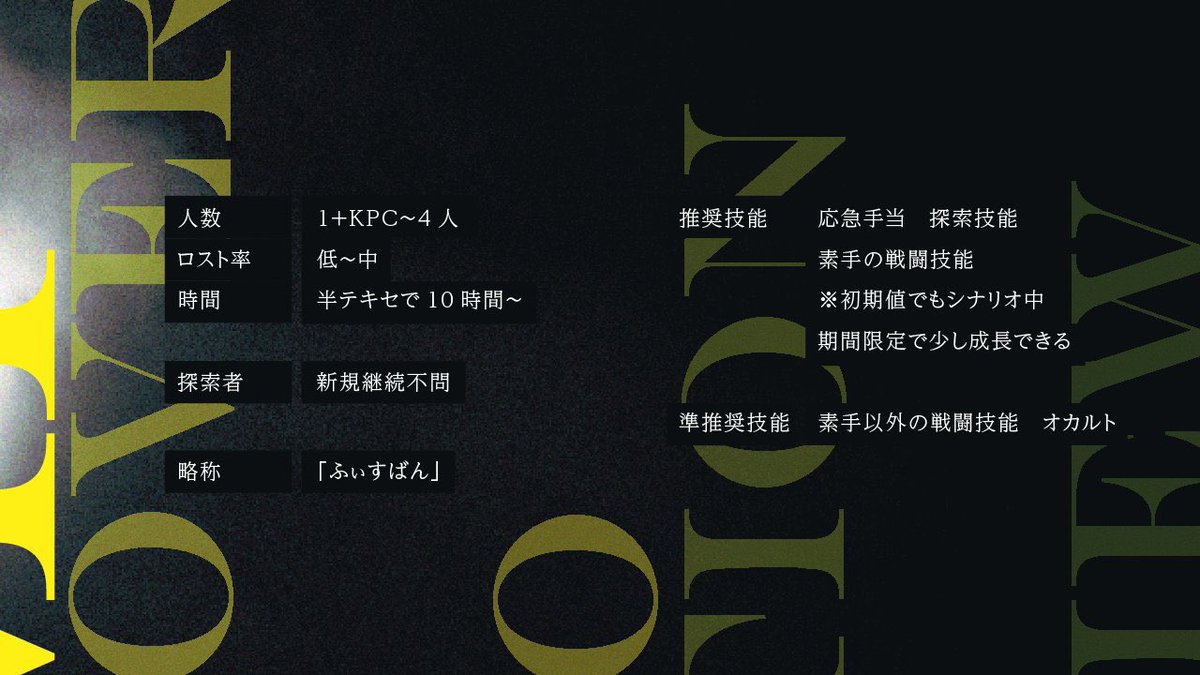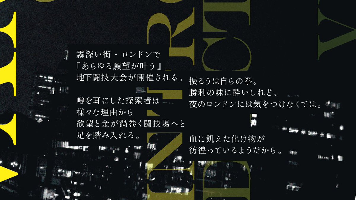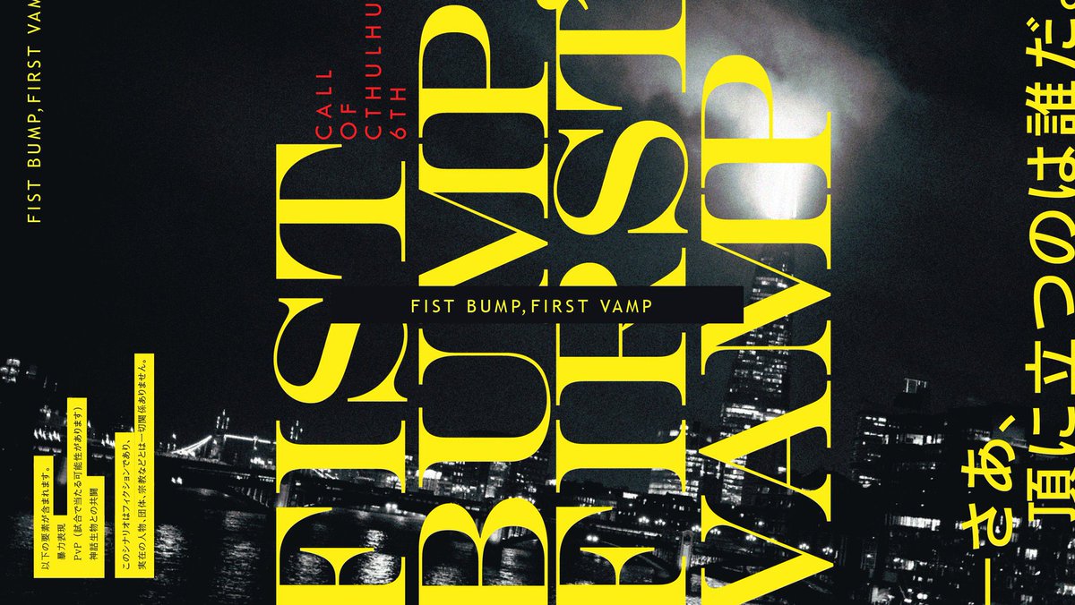【シナリオ告知】 ー頂に立つのは誰だ。 クトゥルフ神話TRPG非公式シナリオ 「FIST BUMP, FIRST VAMP」 ロンドン×ステゴロ×地下闘技 1/23 BOOTHにて公開。 トレーラーは大点(