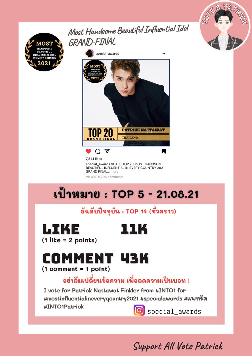 📣อัพเดตคะแนนจาก IG ของ Special awards ของแพทริค ตอนนี้ยังอยู่ที่อันดับ 3 นะคะ😺