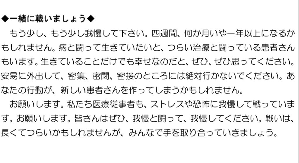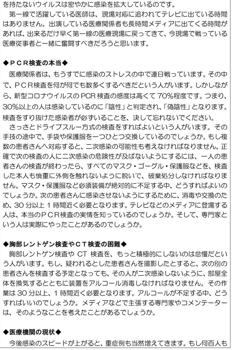 第一線で活躍している医師は、現場対応に追われてテレビに出ている時間はありません。出演している医療関係者も長時間メディアに出てくる時間があれば、出来るだけ早く第一線の医療現場に戻ってきて、今現場で戦っている医療従事者と一緒に奮闘すべきだろうと思います。