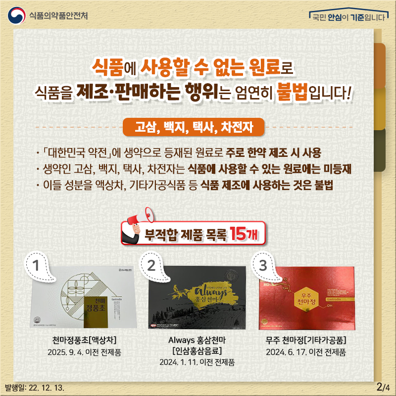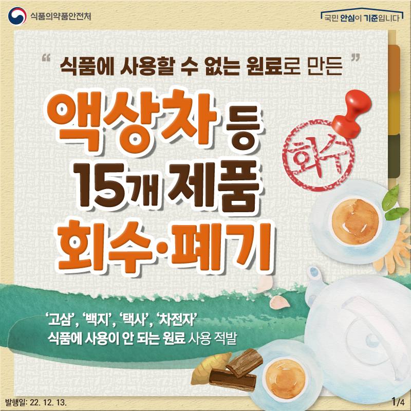 식품 사용 불가 원료로 만든 #액상차 등을 부당광고(질병 예방에 효능·효과가 있는 것처럼)하여 고가에 판매하는 업체를 적발하였습니다. 해당 제품을 회수·폐기처리 하오니 이를 구매했다면 섭취를 중단하고, 구입처에 반품해 주세요!