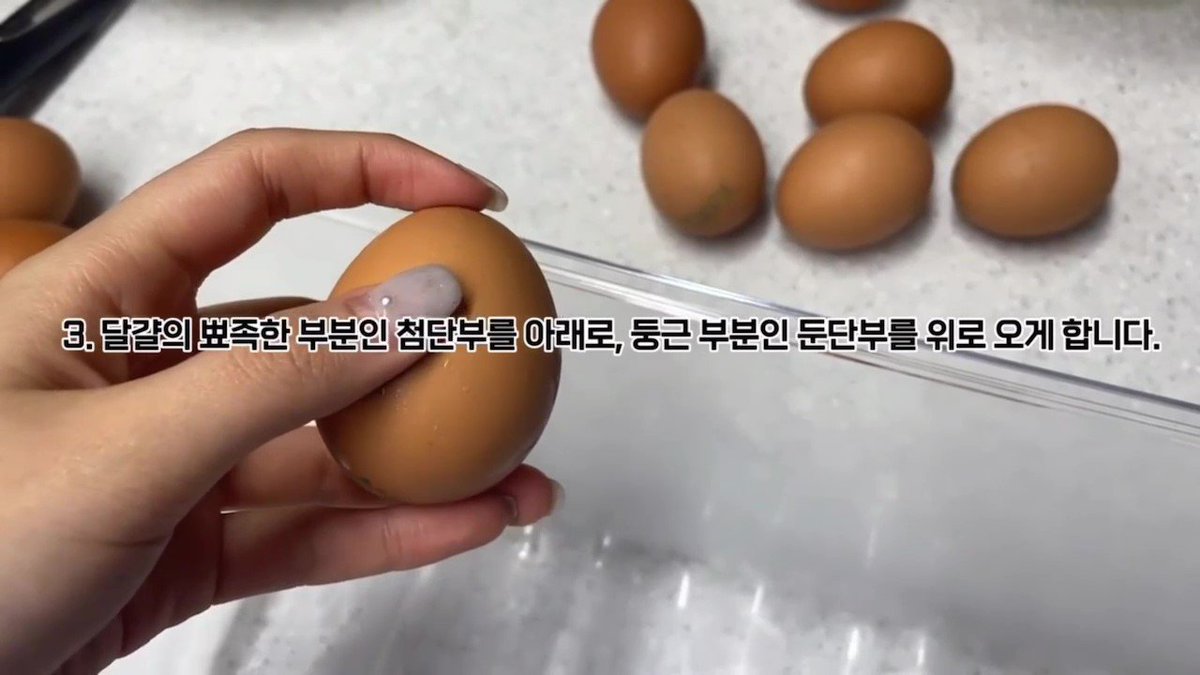 달걀은 온도에 민감한 식재료라 냉장고 안 쪽에 보관하는 것이 좋아요. 또 물에 씻지 말고, 뾰족한 부분인 첨단부를 아래로, 둥근 부분인 둔단부를 위로 오게 보관해 주세요😀
