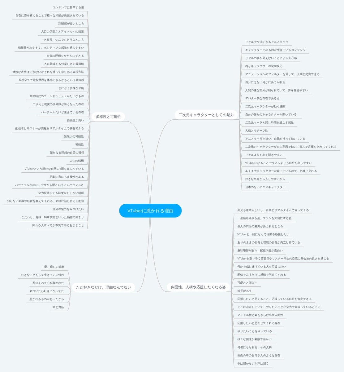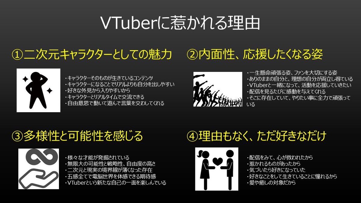 無知な私に教えて下さい。VTuberのファンやリスナーは彼女彼らの何に惹かれるのか。可愛いカッコいい楽しい癒される…もっと深い何かがあるのは間違いないと思います。もっと「V」を知っていきたい。熱量持って知りたい。Vの方もファンの方も熱量の凄い理由深掘りしたいです。何だと思われますか?