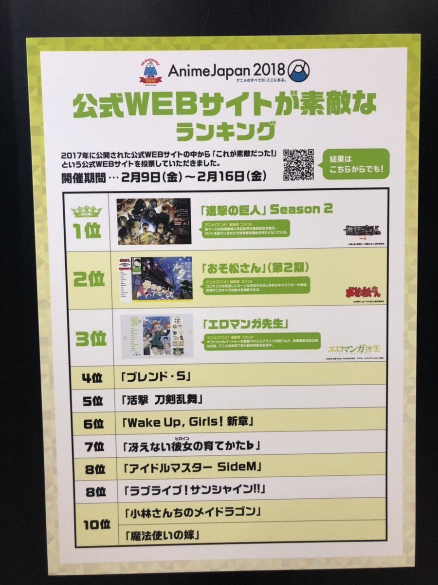 「公式サイトが素敵なランキング」2017年度版で 『エロマンガ先生』が3位に選ばれた事を受け