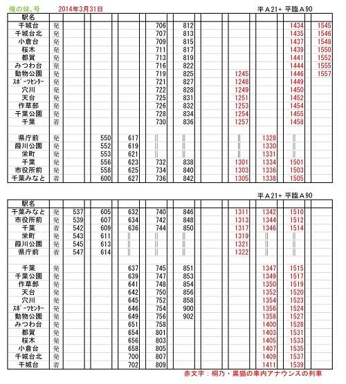 また、コラボラッピングモノレール最終運行日の3/31に、臨時列車の運行が追加されます。臨時列車では全区間桐乃・黒猫のアナウンスを実施します。画像は3/31の運行予定、詳細な情報は chiba-monorail.co.jp/index.php/2014…