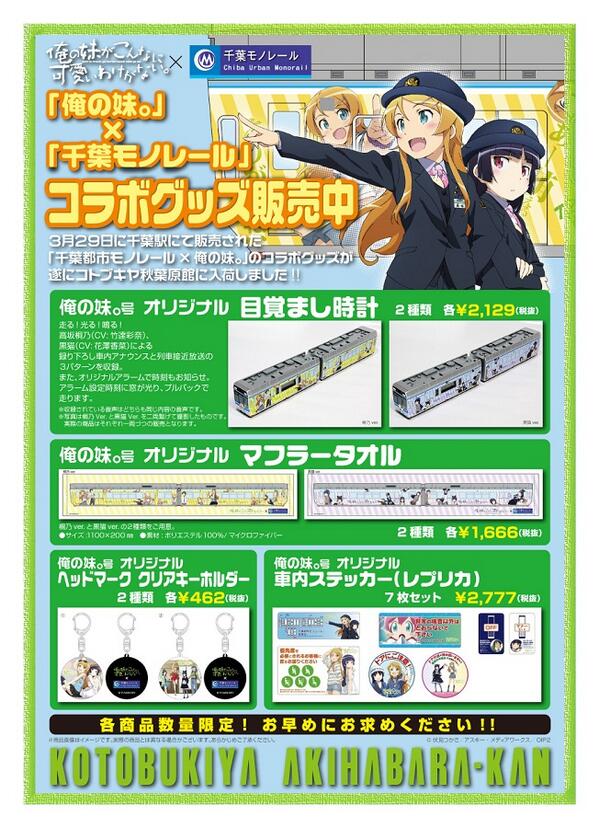 コトブキヤ秋葉原館3階にて「千葉都市モノレール×俺の妹。」ラッピングモノレールの記念グッズが大好評販売中です。目覚まし時計などのグッズを秋葉原でも買えます。数量限定販売ですのでお早めに! oreimo-anime.com/news/index.htm…