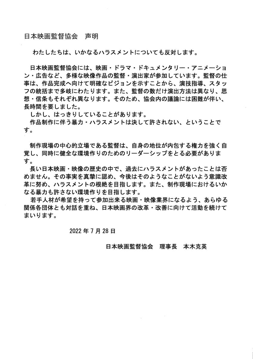 声明は「いかなるハラスメントについても反対します」と書き出し、「制作現場の中心的立場である監督は、自身の地位が内包する権力を強く自覚し、同時に健全な環境作りのためのリーダーシップをとる必要がある」と指摘。