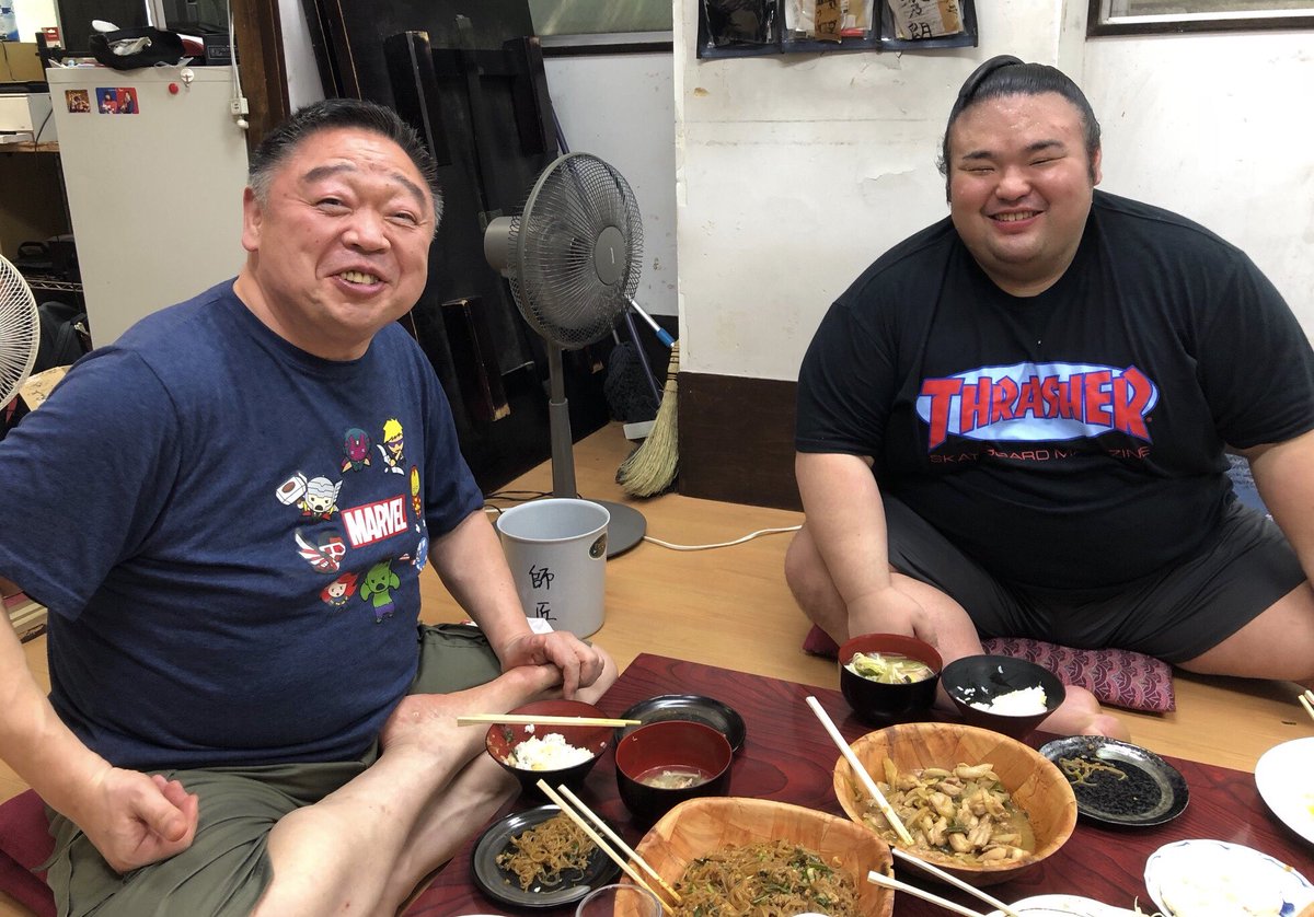 本日朝稽古をモンゴルから来日した貴ノ岩が見にきてくれました。稽古の後にみんなで相撲の話や色々とおしゃべりしながらちゃんこを食べました。岩さんは35キロ体重を絞ってました。(おかみさんより)