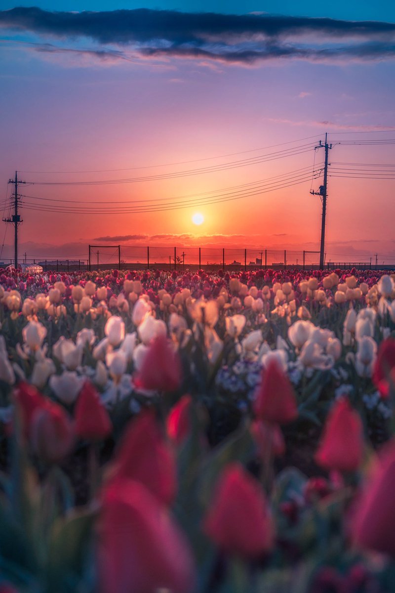 グラデーションの空の下で咲くチューリップが切なく美しかった