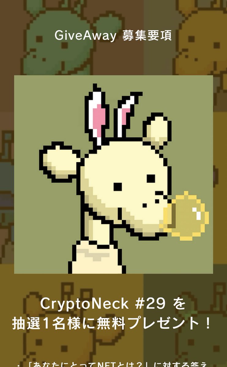 ⭐️Giveawayやります⭐️ 【HP公開記念ゲリラ企画】 ※応募方法はHPにて いきなりですがGiveawayやります⭐️ HP公開を記念して1名様に『CryptoNeck#29』 (コレクション平均約0.14ETH)をプレゼント⭐️ 当選者の方にはDMします🦒 「↓あなたにとってNFTとは?」