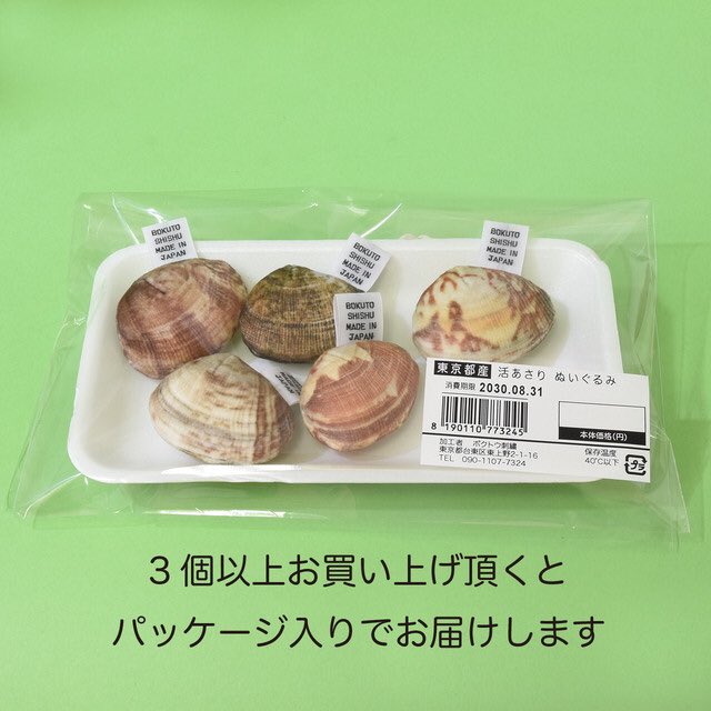 アサリのぬいぐるみです。5種類の柄、それぞれマグネット入りとボールチェーン付きを選べます。