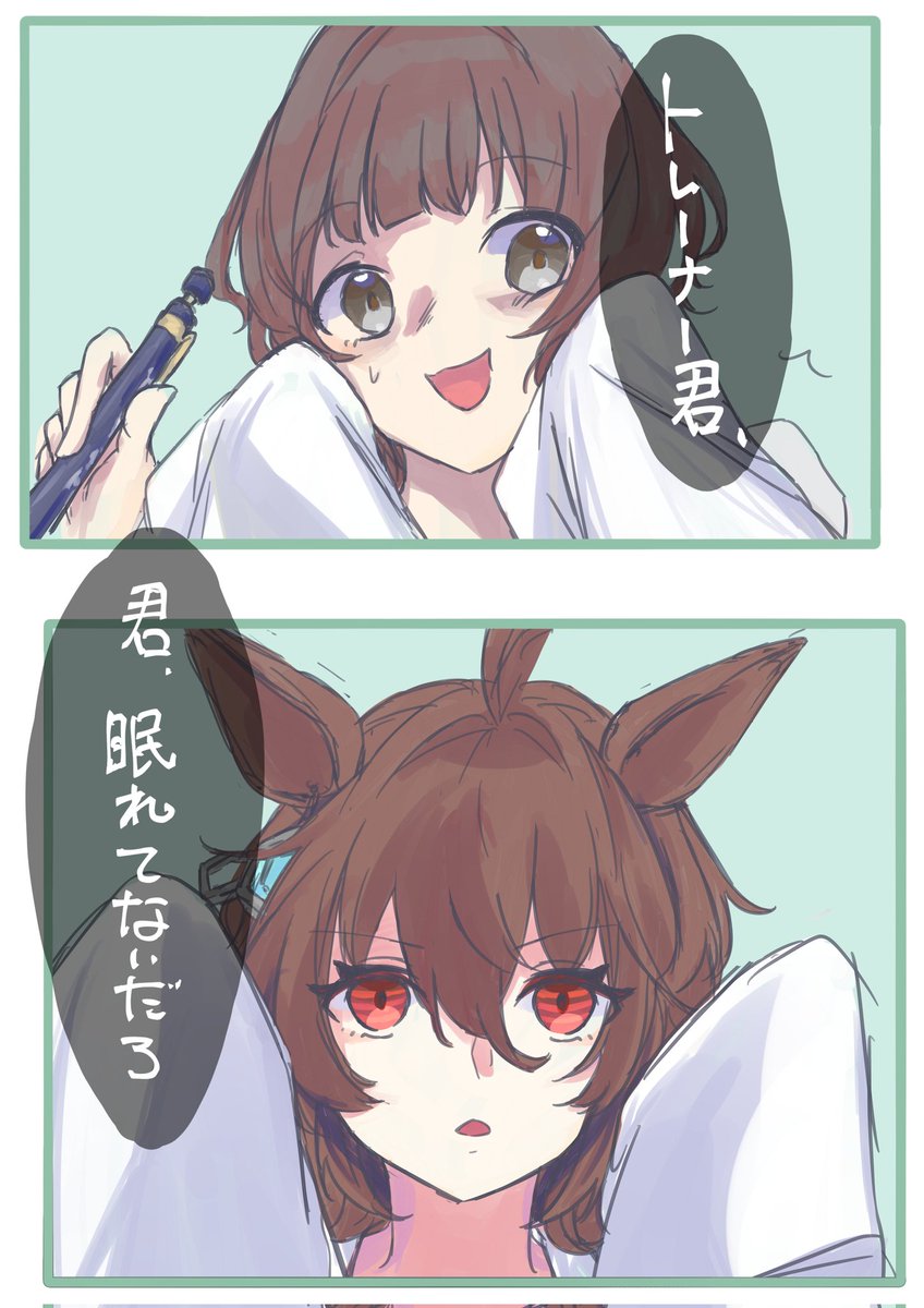 ⚠オリトレ顔あり注意⚠ タキモル♀ 寝不足トレとタキオン。 タキ「モルモットくんは被検体としての自覚を持つべきだね(意訳:休め)」