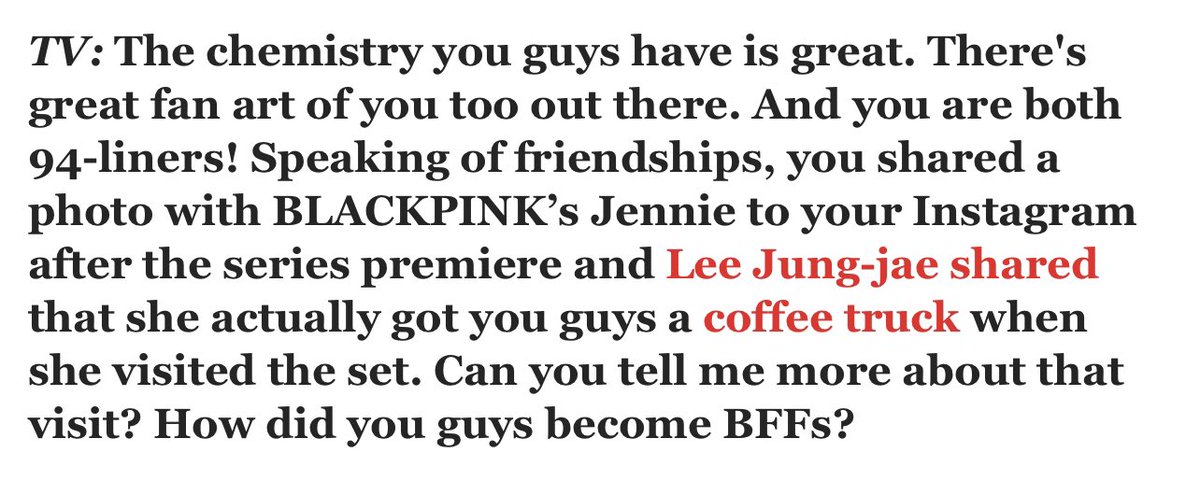 “She’s been fully supportive of my new acting career and I believe that she's a true angel. I'm so grateful for everything. She sent a coffee truck and she was very happy for me when I first got the role. I can't really express how grateful I am to her.” - Jung Hoyeon on #JENNIE