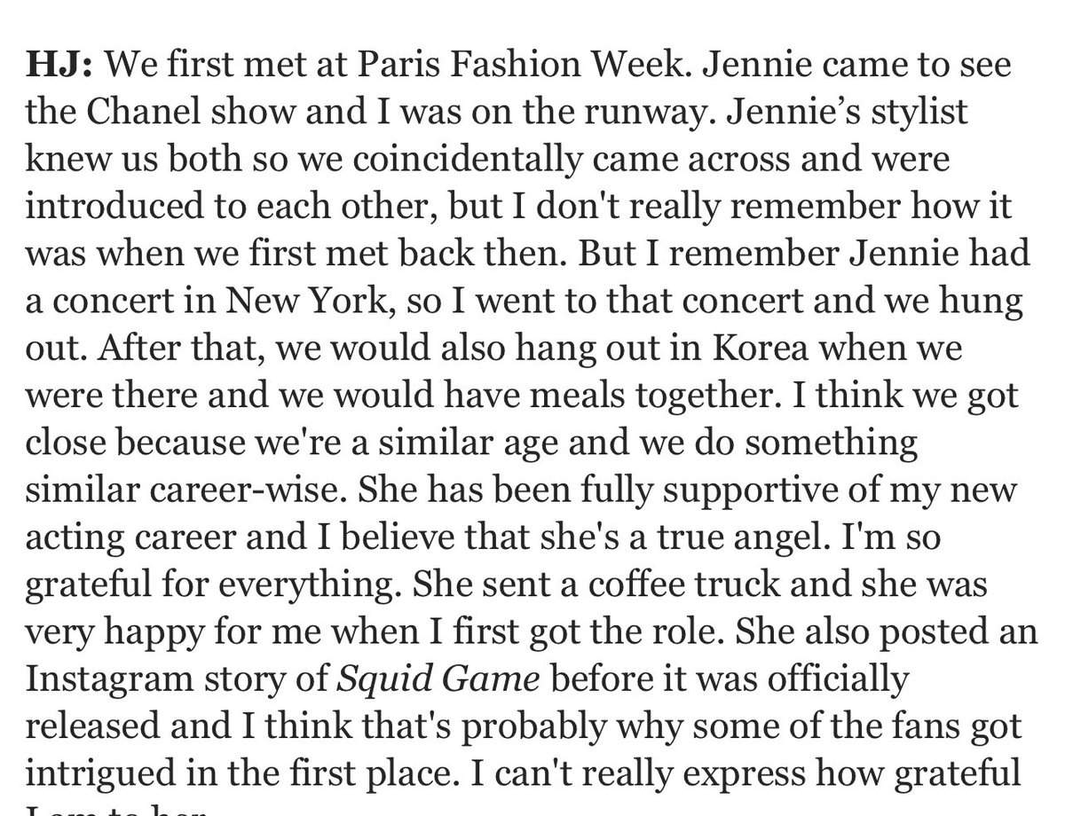 “I remember Jennie had a concert in New York so I went to that concert & we hung out. After that, we’d also hang out in Korea when we were there & have meals together. I think we got close because we're a similar age & we do something similar career-wise” - Jung Hoyeon on #JENNIE