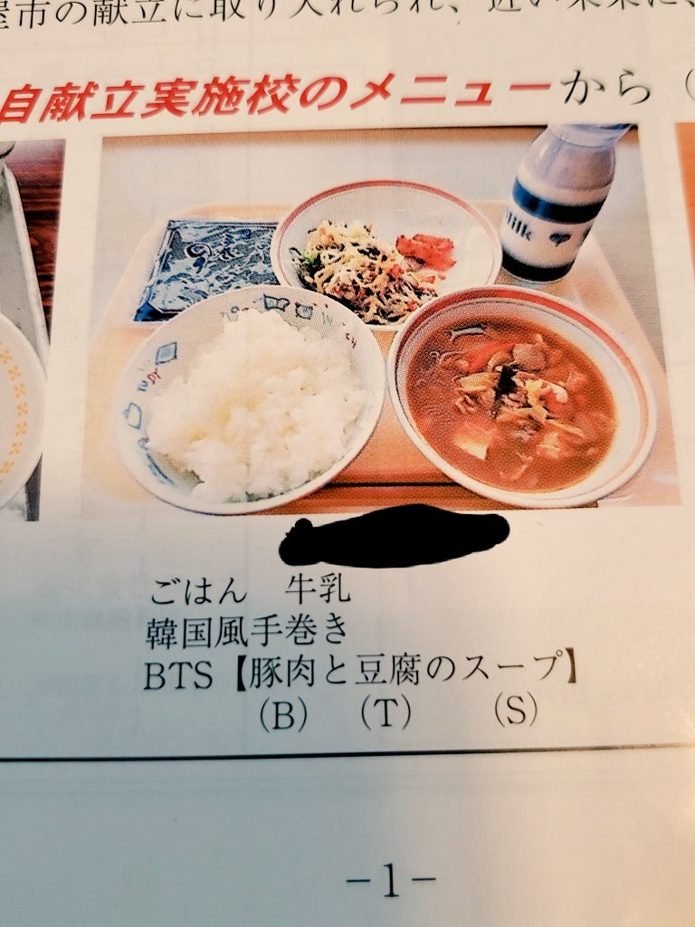 昨日子どもが貰ってきたプリント 給食の献立にBTS♡ 美味しそう… (市内のとある小学校で出た献立です。うちの学校ではありません)