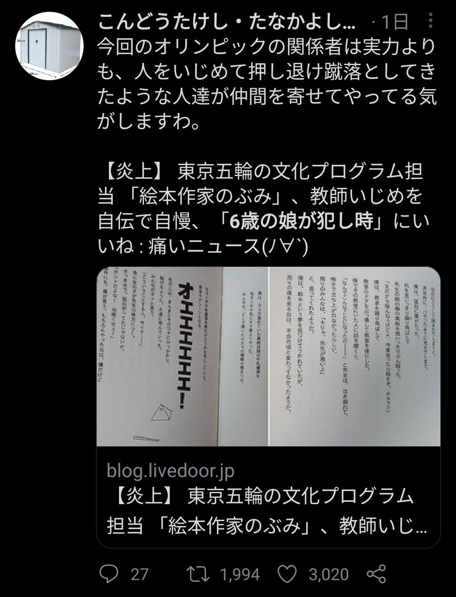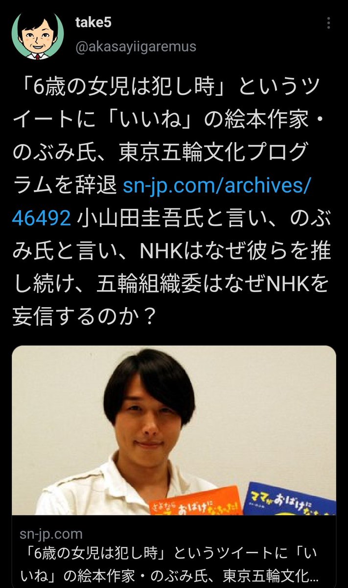 【悲報】浪人界隈、東京五輪に影響を与えてしまう 絵本作家のぶみ『従姉が知らぬ間に作ってた娘、6歳らしいし犯し時だよね』にいいねし炎上