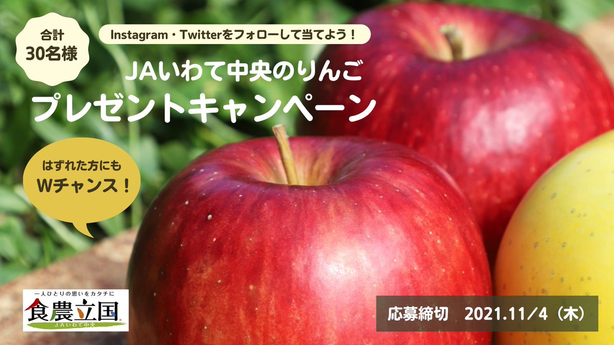 🍎JAいわて中央のりんご プレゼントキャンペーン🍎 \ 「サンふじ」5kgが合計30名様に当たる!/ 〈応募締切〉2021年11日4日(木) 〈応募条件〉 ① @ja_iwatechuoh をフォロー ② この投稿を「リツイート」 応募フォーム・詳細はこちら ja-iwatechuoh.or.jp/2021/10/01/app… #JAいわて中央 #キャンペーン