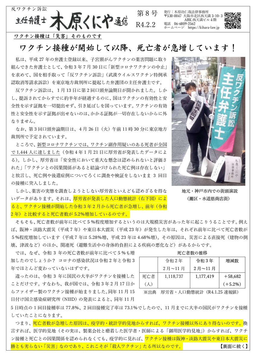 【事務局からのお知らせ】塚口氏の多大なるご協力を賜り、ワクチン副作用で苦しむ同胞を救い、これ以上、ワクチン被害者を出さない!もはやメディアが真実報道を無視できない所まで追い込む!全国の皆さまと団結し、街宣・デモを決行いたします。13(木)東京地裁へご結集をお願いします。 twitter.com/higashimita031…