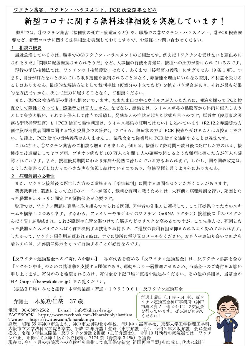 2 ワクチン薬害、ワクチン・ハラスメント、PCR検査強制などの、新型コロナに関する無料法律相談を実施しています!