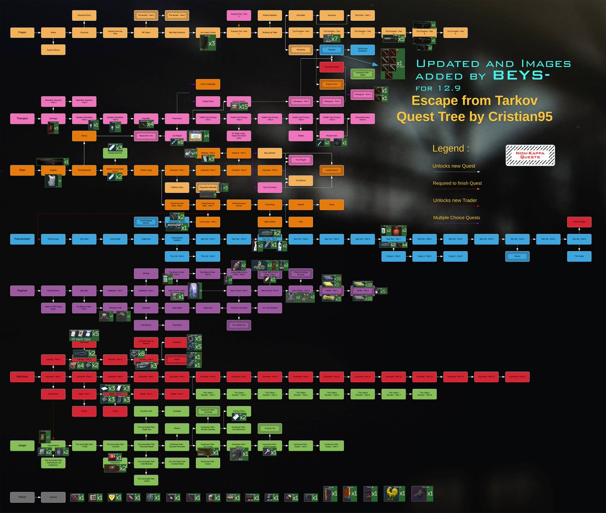 タルコフワイプ前みたいですね。ハイドアウト&クエストに必要なアイテム一覧見つけたので良かったら見てね。赤い数字がインレイド品の必要個数なので拾ったら取っといたほうがいいかも。まあ、一つ言えるのは、、、