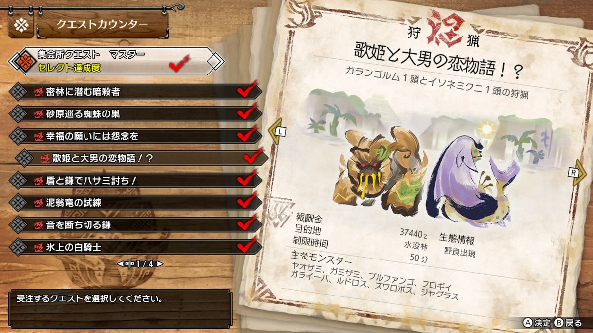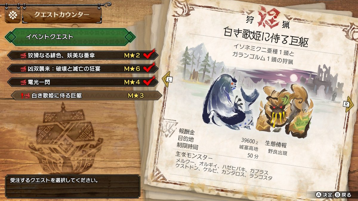 今更かもだけど、エルガドとカムラの里でクエストの文字の筆書きに違いがあるのちゃんと細かくて良いなぁ…