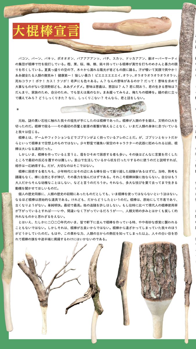 次回の棍棒展の予定は今のところないが、今年10月には棍棒飛ばしの全国大会を開催する。棍棒飛ばしとは、大きい棍棒で小さい棍棒を殴り飛ばし飛距離を競う楽しいチーム競技である(ルールは『棍棒入門』に記載)。まだ競技人口も少ない新興競技だが、大棍棒展をやった我々にならできると自負している。